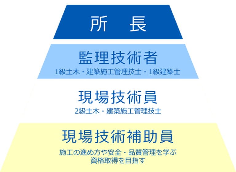 1級施工管理技士を取得すると、現場監督になれるだけでなく、現場を創り上げていく工務長への道も開け、本人の希望と適正により選んでいきます。
