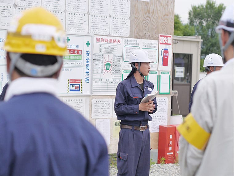 仕事内容と特に危険をともなう作業について注意喚起と対策の確認、夏場は熱中症など体調管理への呼びかけもします。100名の作業員さんの前で朝礼を任されることもあります。