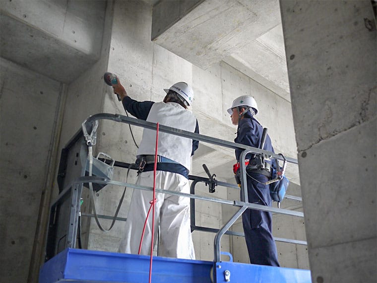 コンクリートの補修作業中、高所作業車での作業となるので、落下防止の安全帯を使用していうrか目線確認と指差しチェック。作業員から質問を受けることもあり、その場で的確な指示を出す知識と経験が求められます。