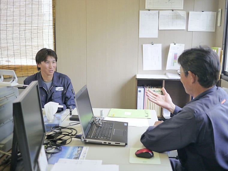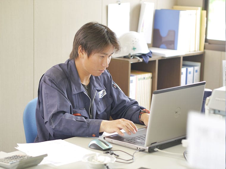 現場事務所に戻り、1日の施工結果の記録書類を作成。写真データも毎日きちんと整理、チェックします。今日の作業内容を振り返りつつ、明日の準備や予定を確認します。
